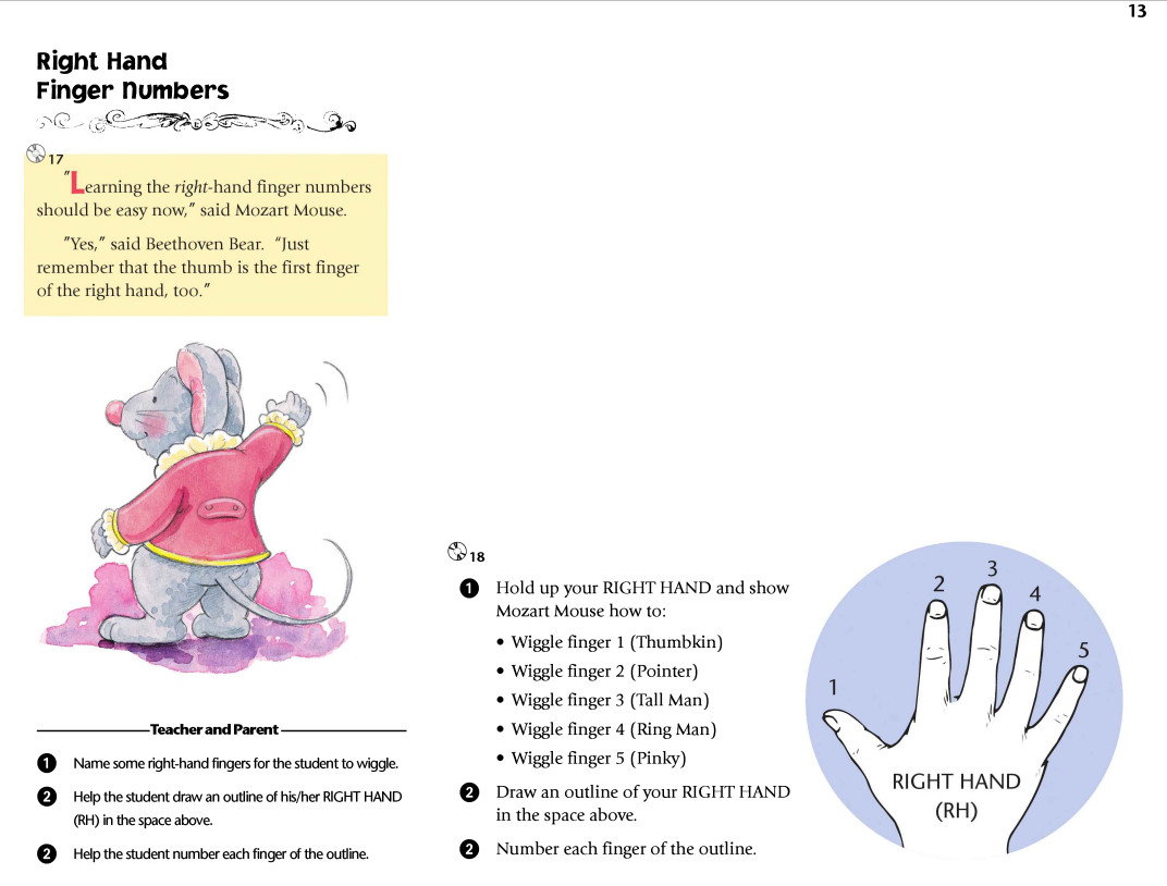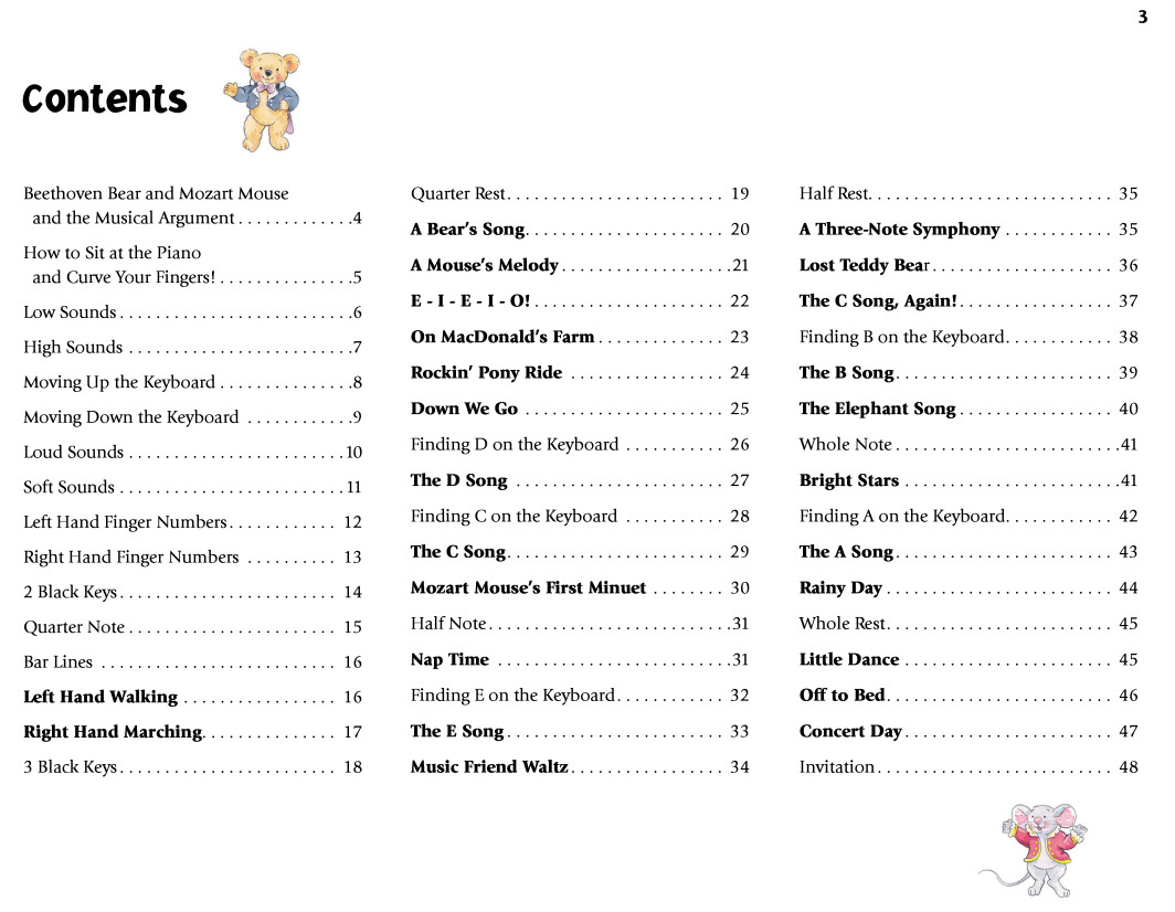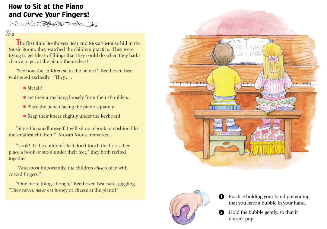 Buku Pelajaran Musik adalah inti dari kursus ini. Siswa diperkenalkan dengan konsep musik baru dan penampilan lagu di piano. Kisah Beethoven Bear dan Mozart Mouse™ menjadi landasan bagi pembelajaran musik di awal dan berlanjut di setiap halaman berikutnya. Karakter lain di sepanjang buku ini berfungsi sebagai batu loncatan untuk memperkenalkan siswa kepada komposer besar dari empat periode gaya musik utama.